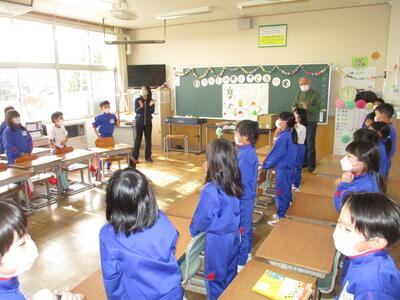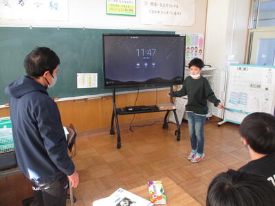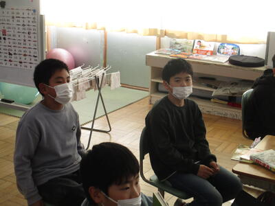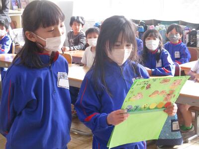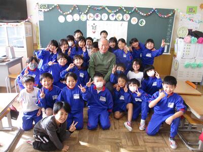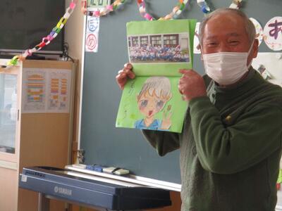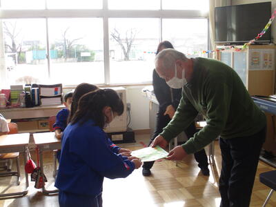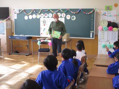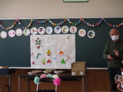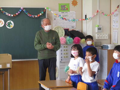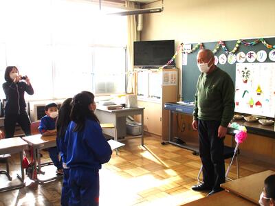 12月19日 2年生の収穫祭には、トウモロコシやサツマイモづくりでたいへんお世話になった、学校運営協議会(コミュニティースクール)の会長さんをお招きし、それぞれの学級で感謝を伝えました。