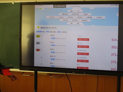 「福島県なわとびコンテスト」とは、各学級の長縄跳びの記録や短縄跳びの個人記録をウェブ上に登録して競い合うともの。県内の小学校とランキング形式で切磋琢磨していきます。春蘭学級では、もうすでにウェブ上に数値を登録しています。このレスポンスのスピードが春蘭パワー。