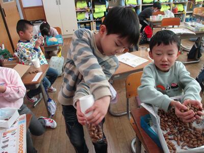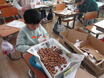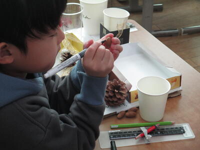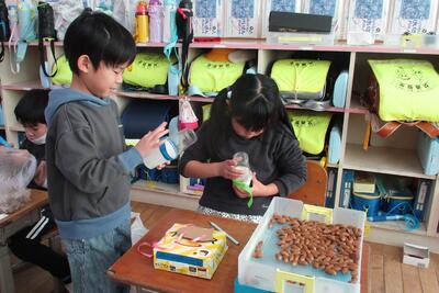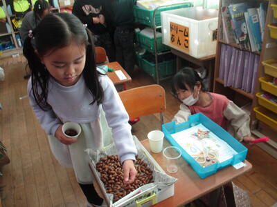 12月4日 1年生が、どんぐりや松ぼっくりを使って、おもちゃ作りに取り組んでいました。