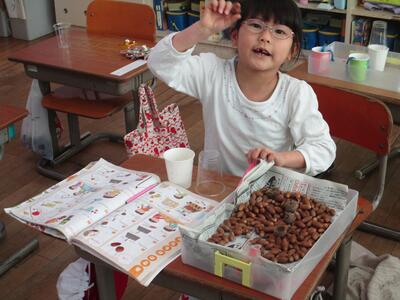 どんぐりはたっぷりとあります。子どもたちの「作ってみたい」に応えるには、十分な素材があってこそ。生活科の学習は、豊富な素材が生命線です。