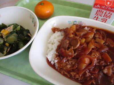 12月4日 今日の給食のメニューは「ハヤシライス」「わかめサラダ」「みかん」でした。