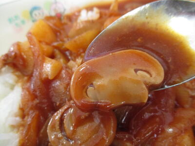 にんじん、じゃがいも、豚肉とおなじみの具のラインナップの中で、ひときわ輝くのがマッシュルーム。小さい頃、給食でマッシュルームを食べた記憶があまりないのですが(あったかなぁ…)、マッシュルームをたくさん食べて健康アップです。昔から、キノコを食べるとパワーアップするテレビゲームが有名ですが、いわねっ子もスーパーイワネっ子に変身ですね