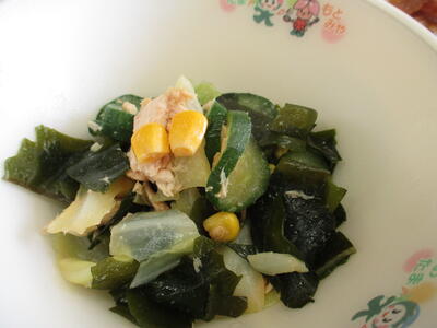 わかめがたっぷり入ったサラダは、脳の働きを意地するヨウ素、体内機能を調整するナトリウムがたくさん含まれています。さらに、骨や歯を作るカルシウムも入っています。スーパー食材ですね。ツナやキュウリ、コーンとの相性は鉄板でした。