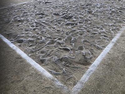 校庭を歩いてみると、砂場はうっすら凍っていました。