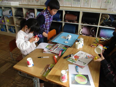 マラカスの中に入れるどんぐりに、真剣に絵を描いていました。物作りの楽しさを味わうことも生活科。