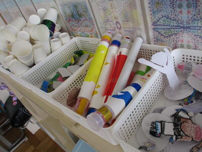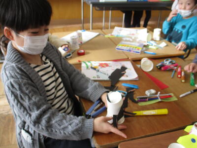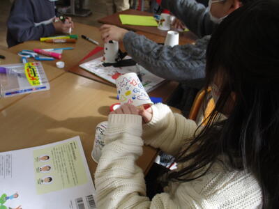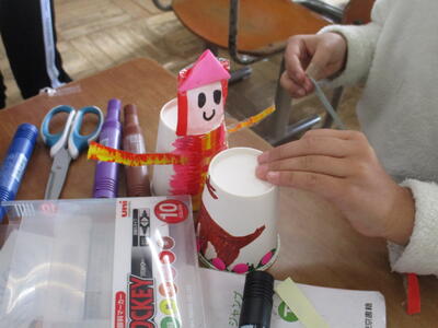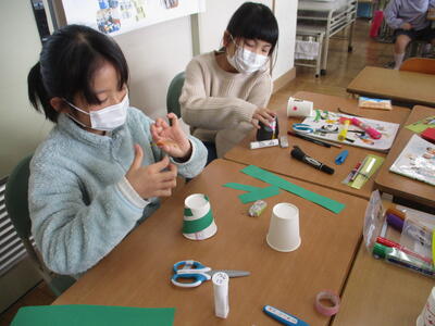 今日は、みんなで「ぴょんコップ」を作っていました。コップを2つ重ねて手を離すと、上に重ねたコップが高く飛び出す仕組みのおもちゃです。
