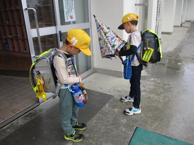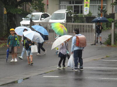 9月27日 今日は朝から雨模様。傘を差しながらでは歩きづらかったと思いますが、班長さんを先頭にがんばって登校してきました。改めて見てみると、1年生にとって傘は大きいですね。傘を差している時の歩き方について、改めて注意を促していきます。