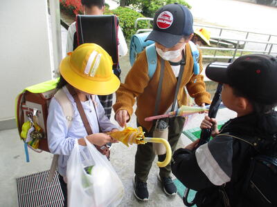 すると、4年生が1年生に傘の丸め方を教えていました。