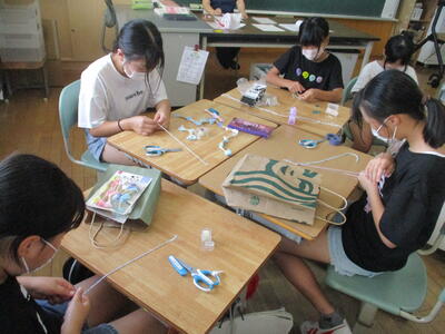 手芸クラブでは、いろいろな学年が混ざって、グループでミサンガづくりをしていました。グループでの何気ない会話も楽しいものです。