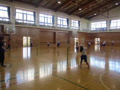 体育館では、バドミントンクラブが思い切り体を動かしていました。3分の時間制限を設けて、ローテーションでいろいろな友達と対戦するようにしていました。