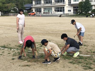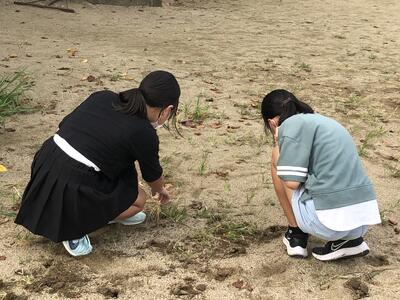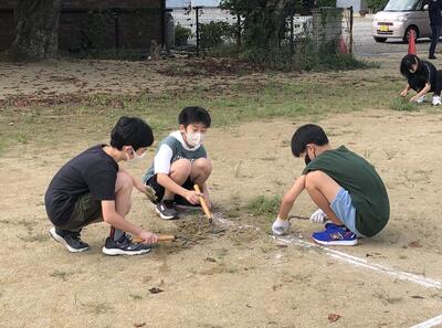 9月13日 朝、6年生が校庭に出てきました。校庭に生えている雑草を取るためです。