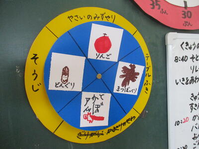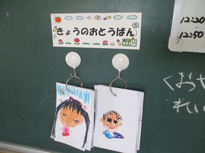 黒板には「きょうのおとうばん」という掲示が貼ってありました。これは、小学校で言うところの「日直」ですね。幼稚園でもすでに日直活動をしていることを知っていれば、小学校に入学してすぐ「日直」に取り組ませることができます。生活づくりも早くできますし、いわゆる「お客様」の状態を短くすることもできます。