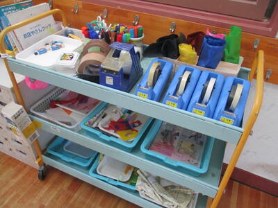 活動に使う文房具も、どこに何を置くかが明確で、園児でも片付けしやすいように工夫されています。このようになっていれば、「ちゃんと片付けよう」というふわっとした指示ではなく、「セロテープの部屋に置いてきてね」と言った具体的な指示になり、片付けもしやすくなります。シンプルで分かりやすい環境は、小学校でも参考にしていきたいところです。