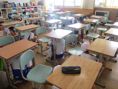 放送による指示を聞いて、子どもたちは机の下にすばやく隠れます。放送をしっかり聞いているからこそできることです。