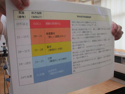 教務の先生からは、「熱中症警戒アラートの意味」「どうしてアラートが必要なのか」「どのような状態になると外で遊べなくなるのか」について分かりやすい説明がありました。