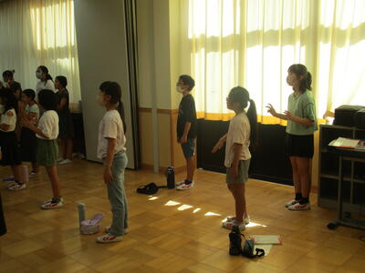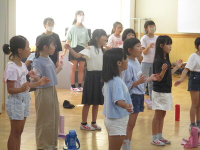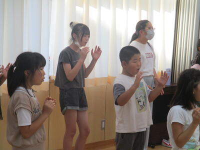 声のボリュームが高まっていく様子をジェスチャーで表現しながら、歌のイメージを広げていきます。体で歌う子どもたち。