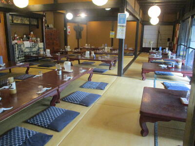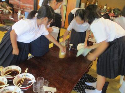 お店の方が片付けをしやすいよう器を一カ所ににまとめたり、机をきれいに拭いたり、座布団を整えたりしていました。