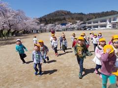 年長組は、満開の桜の中で、元気いっぱい小学校校庭での外遊びを楽しんでいます。