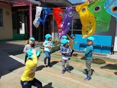 年長組が作ったこいのぼりを喜んで眺める年少組さん。