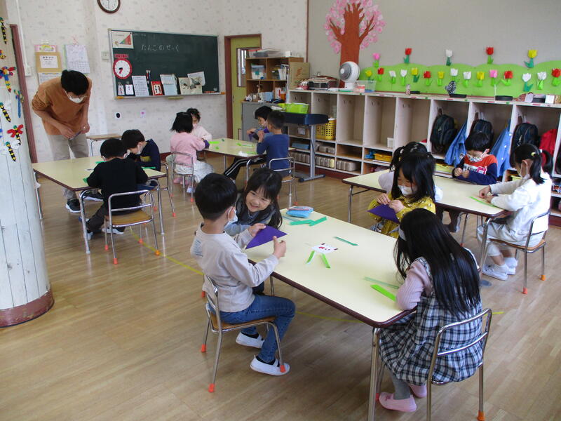 年長組は折り紙で菖蒲の花を作りました。健康に過ごせるよう願いが込められています。