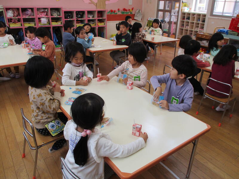 年少組はこどもの日に由来する絵本を聞いたり、みんなでおやつを食べて友達と楽しい時間を過ごしました。