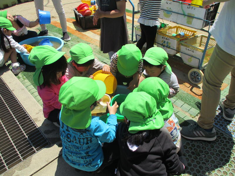 気温の高い日が多くなり、外では水を使った遊び楽しんでいます。