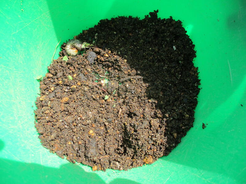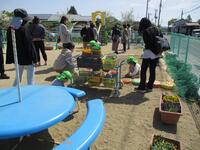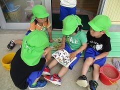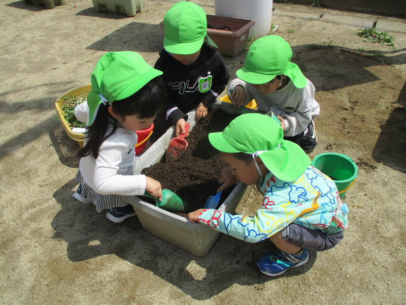 年少組はプランターの植え替えをした後に、みんなで土を掘ってみました。すると、中から幼虫が!!
