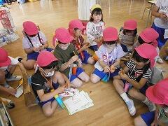 年少さんも金魚すくい屋さん、おめん屋さん、アクセサリー屋さん、楽器屋さん、食べ物屋さん、射的屋さんなどたくさんのお店があって、とても喜んで買い物をしていました。