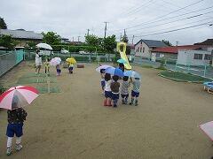 雨の中傘をさして園庭にお散歩に出かけ、傘をさしての歩き方も学びました。