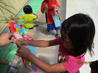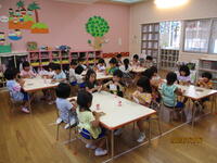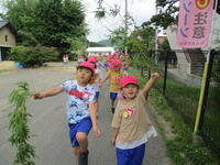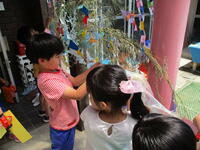 5日(水)に近所のおじいちゃんから笹をもらい、準備してきた七夕飾りで飾り付けました。年少組のお友達は年長組さんがもらってきた笹の大きさに驚いたり、喜んだりしながら、飾り付けを楽しみました。
