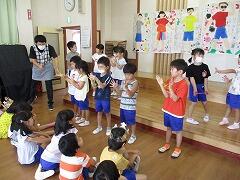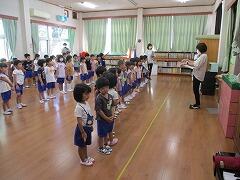 終業式では、園長先生から1学期の成長を認めてもらったり、夏休みの過ごし方を聞いたりしました。みんな上手に話しを聞くことができるようになってきました。