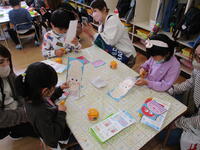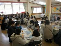 年少さんはクレヨン遊び、年長さんは切り紙遊びをお父さんやお母さんと一緒に楽しみました。