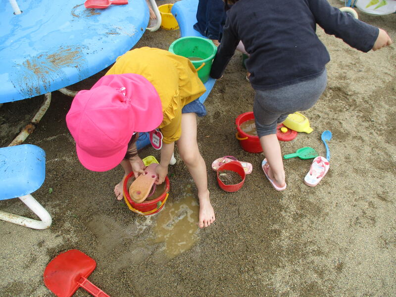 水や砂、泥の感触を全身で味わっています。遊んだ後の片付けもみんなで頑張っています。