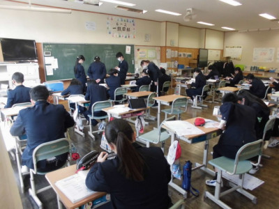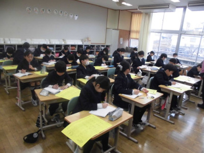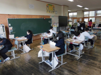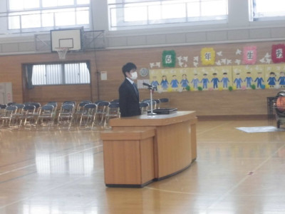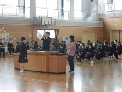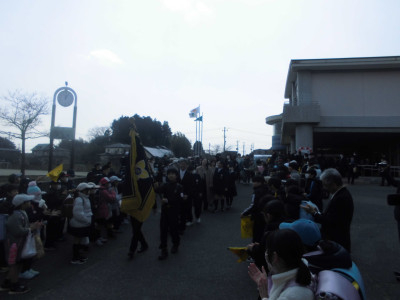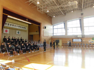 全校生が体育館に集まり、もとみや駅伝に参加する選手たちにエールを送りました。みんなの応援を力に、頑張れまゆみっ子!