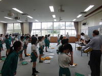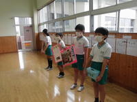 下校前にまゆみ小学校の紺色Tシャツの配付もありました。とても涼しいシャツで洗濯してもすぐに乾くので、明日からたくさん着てほしいと思います。ホームページでも様子を更新していきますのでチェックしてみてください。