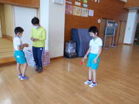 久しぶりにクラスの全員がそろったので、みんなとても嬉しそうでたくさんの笑顔が見られました。本日は暑さもあったため、半袖になるお子さんもいました。自分で考えてブレザーの着脱やブレザーをハンガーに掛ける姿が見られました。