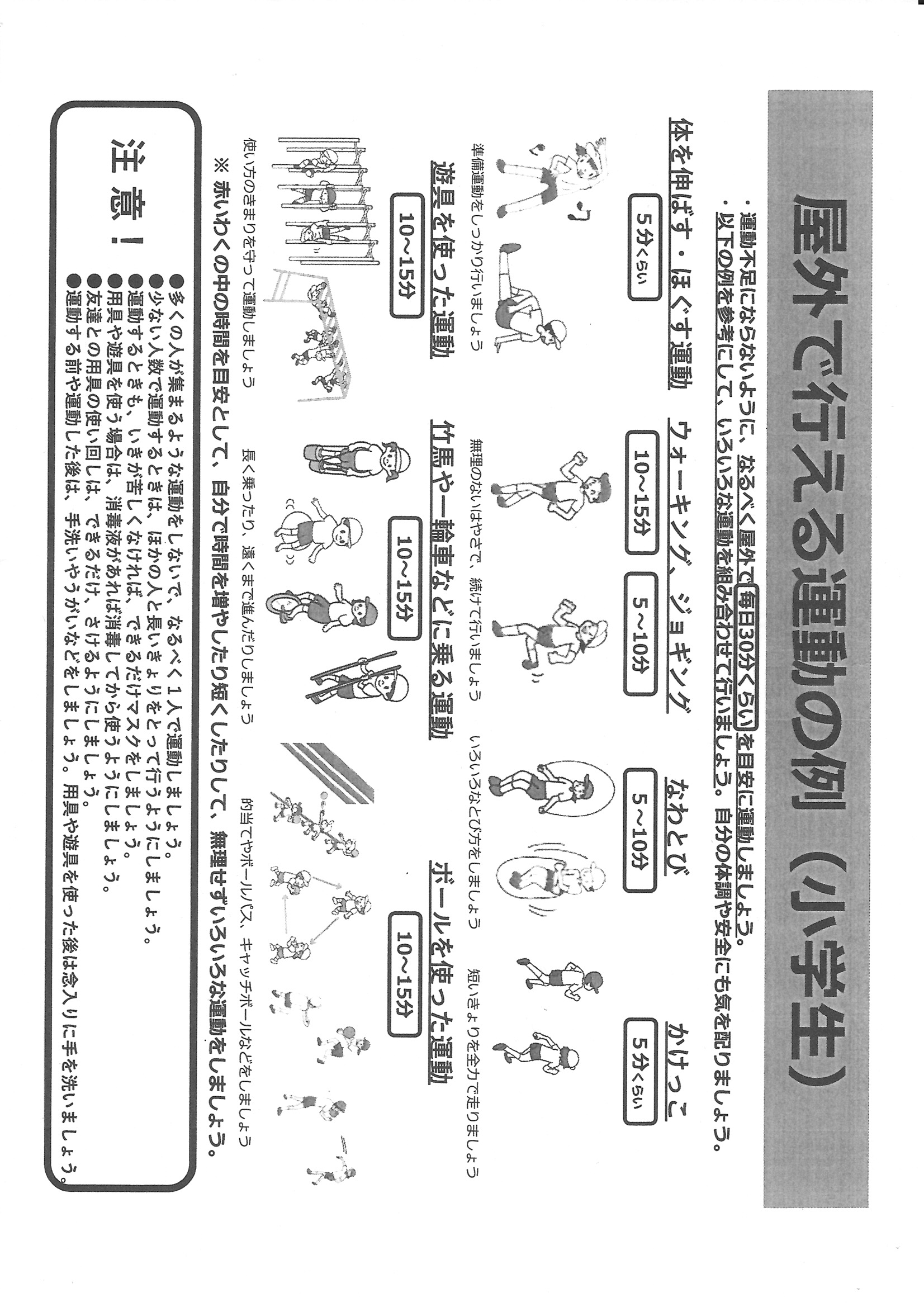 臨時休校が続き、おうちの中で過ごす時間が長くなったことで、なかなか体が動かす機会も少なくなっていることと思われます。体力をつけ、抵抗力を高めることが新型コロナウイルス感染防止にもつながりますので、親子で一緒に体を動かすことをおすすめします。屋外で行える運動をご紹介しますので、公園など広いスペースで少人数で取り組んでみてはいかがでしょうか。