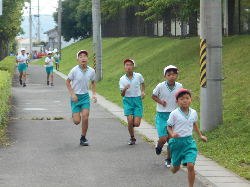 本日、全校生が参加する持久走記録会を実施しました。1・2・3年生の下学年の部が前半(2校時)に、4・5・6年生の上学年の部が後半(3・4校時)に、学校外周コースに挑戦しました。