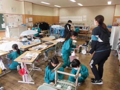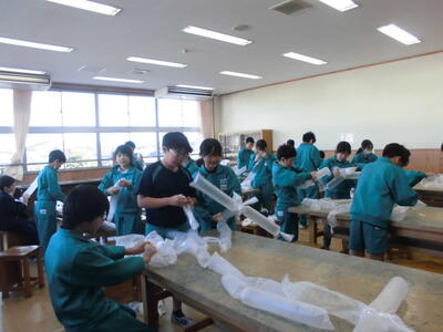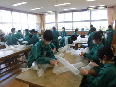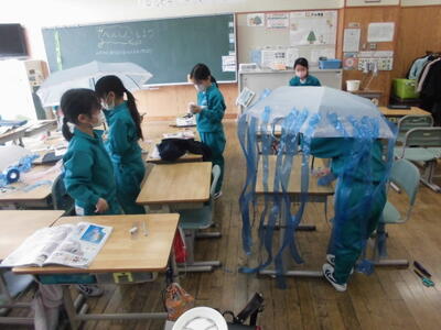 5年1組は図工。かさの袋(ビニール)を用いて表現します。