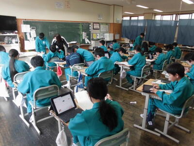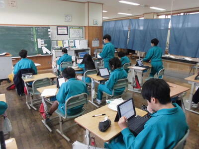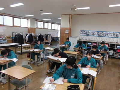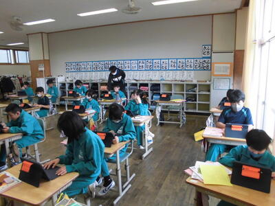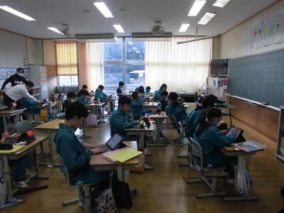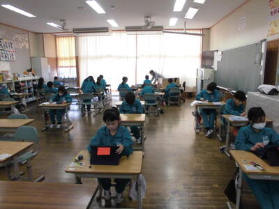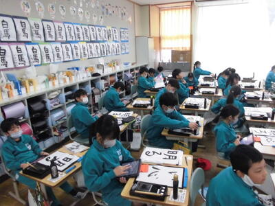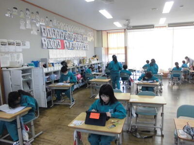 4年1組は書写「明るい心」を書きました。タブレットを使って振り返りを行いました。