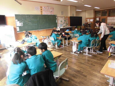 4年1組は算数科。まわりの長さが同じ時の広さについて考え合いました。
