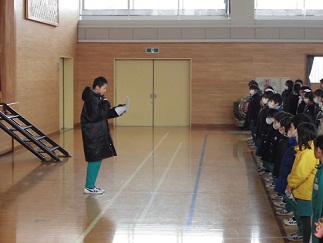 2月2日(金)、豆まき集会が行われました。この日のために企画委員会の児童たちが企画を練り、準備をしてきました。企画委員長から節分についての話を聞いた後、各クラスの代表児童が自分の中の「追い出したい鬼」を発表ました。その後の豆まきでは当たり豆があり、その豆を拾った児童は福男・福女として、賞状を配りました。児童全員が自分の追い出したい鬼を見つけることができたので、今後の生活に生かせるように指導していきます。