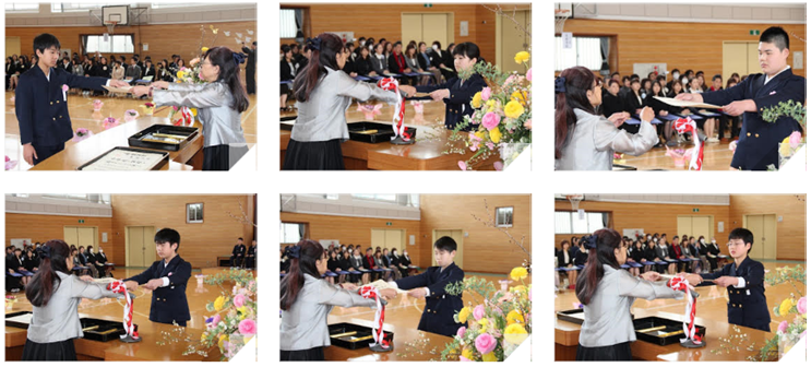 卒業生48名は母校,そして,これまで見守り,支えてくれた保護者と地域の皆さんへの感謝と中学校への決意を証書授与の立派な態度と呼びかけ,歌声で表現することができました。