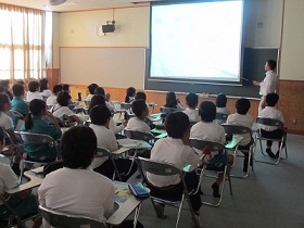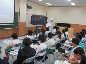 10月14日(金)、5年生を対象とした防災教室が開かれました。講師に福島県二本松土木事務所の職員の方々をお迎えし、災害から身を守るための学習を行いました。自分の知っている地域で起きた災害の写真や映像を見ることで、子どもたちは災害から身を守る意識を高めました。また、模型を用いて土砂崩れを防ぐための対策も説明していただき、自分たちの生活がどのように守られているのかを学ぶ機会となりました。
