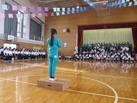 10月5日(水)、第5学年を対象とした「夢の教室」が開かれました。「夢先生」が小学校を訪れ、自らの体験をもとに「夢をもつこと、それに向かって努力することの大切さ」、「仲間と協力することや、助けあうことの重要性」などをゲームや講義を通して子どもたちに伝えました。本校には夢先生として元陸上選手の湯田友美さんをお招きしました。