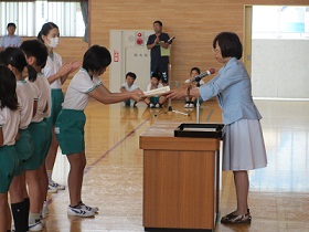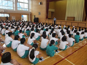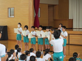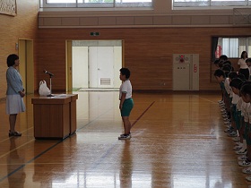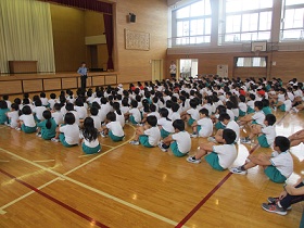 9月15日(木)に全校集会が行われました。代表児童に続いて、全校児童が元気よくあいさつをし、一日を気持ちよくスタートしました。本校では朝のあいさつ運動に力を入れており、今学期も継続しています。