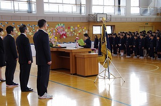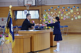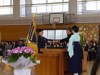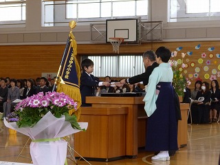 本日、10時から平成26年度卒業証書授与式が行われました。卒業証書授与では、校長先生から堂々と卒業証書を受け取り、保護者のもとへ。「ありがとうございました。」の言葉に感動された保護者の目には涙があふれていました。呼びかけでは、卒業生も在校生も心をこめて行い、最後の「旅立ちの日に」の合唱では、会場中が感動に包まれました。