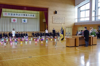 10時からは、入学式が行われました。43名の新入学児童が入学しました。呼名では、一人一人、大きな声で返事することができました。6年生の代表児童が、「困った時はいつでも助けます。明日から一緒に登校してきましょう。」と歓迎の言葉を述べました。