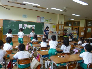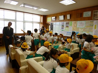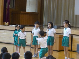5月1日(金)、1.2年生のなかよし会が行われました。2年生が計画を立て、「名前な~に?」のゲームをしたり、「ひらいたひらいた」「しろくまのジェンカ」の曲に合わせて体を動かしたりして遊びました。その後、2年生が1年生の手を引きながら学校を案内しました。この日ばかりは、校長室が1年生でいっぱいになりました。