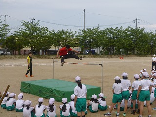 5月18日(月)、午後からJvicの講師の方3名から、陸上の指導をしていただきました。最初は、スキップやクロスステップなど基本の運動をポイントを教えていただきながら行いました。講師の先生のスキップの高さや体の使い方、スピードなどに子どもたちは驚き、少しでも近づこうと一生懸命に行っていました。講師の方による、走り幅跳び、走り高跳び、ハードル走では、スピードや高さに子どもたちは魅了されていました。その後、種目に分かれ練習をしました。